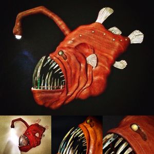 12”x17” Koa wood, red abalone, green abalone, black abalone, Paua abalone & gold pearl shell with integrated LED lit lure.