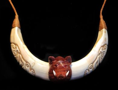 Pua’a (boar) head/tusk pendant featuring Marquesan Tiki relief carving.
